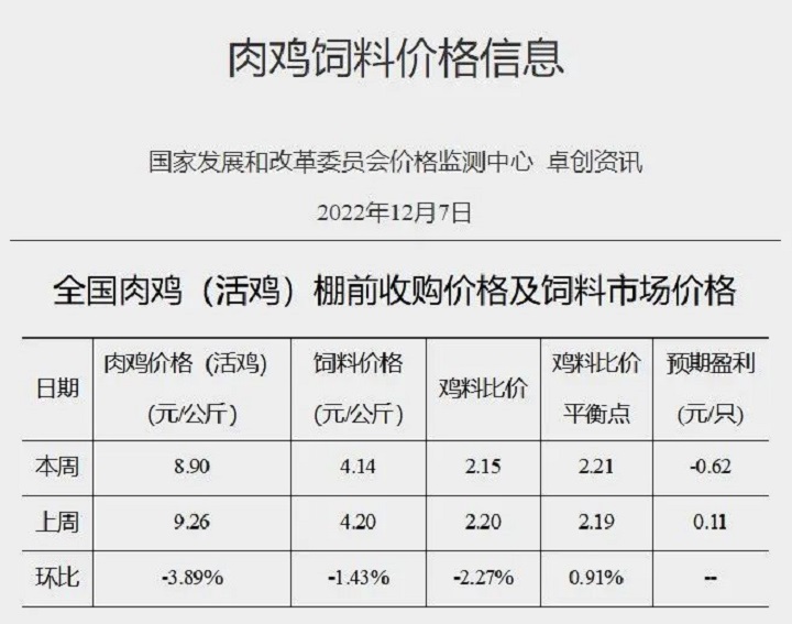 2022年12月第1周全國(guó)雞料比價(jià)為2.15,環(huán)比下降2.27%。按目前價(jià)格及成本推算,未來(lái)肉雞養(yǎng)殖預(yù)期虧損為0.62元/只。本周終端市場(chǎng)需求減少,屠宰企業(yè)計(jì)劃收購(gòu)量降低,而周內(nèi)毛雞出欄量相對(duì)集中,走貨速度不快,毛雞均價(jià)下跌。下周產(chǎn)品市場(chǎng)表現(xiàn)較為平淡,屠宰企業(yè)計(jì)劃收購(gòu)量有限,但毛雞出欄量減少,走貨速度大致趨穩(wěn),預(yù)計(jì)毛雞價(jià)格或以穩(wěn)為主。