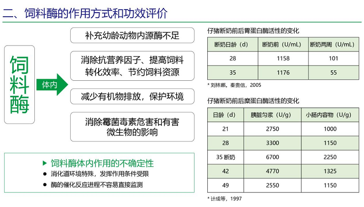 飼料酶在體內(nèi)可以補(bǔ)充幼齡動物內(nèi)源酶不足、消除抗?fàn)I養(yǎng)因子、提高飼料轉(zhuǎn)化效率、節(jié)約飼料資源、減少有機(jī)物排放,保護(hù)環(huán)境、消除體內(nèi)霉菌毒素危害和有害微生物的影響。
